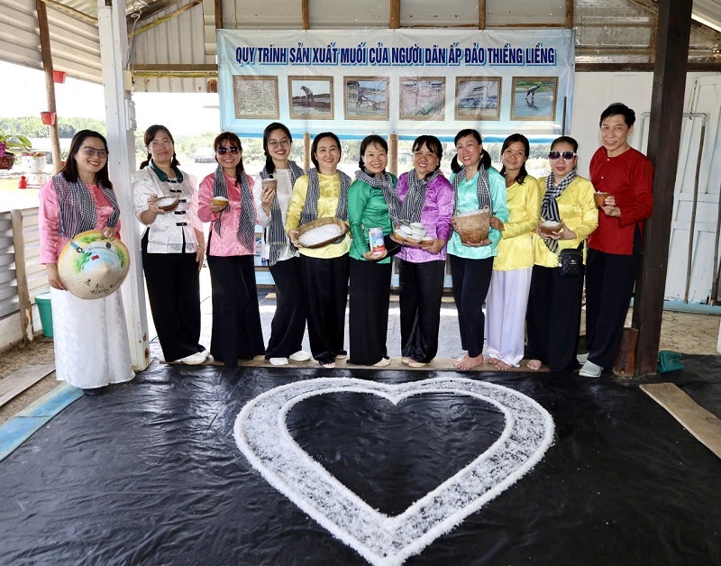Du khách xem cánh đồng muối Thiềng Liềng, quy trình làm muối của diêm dân xứ đảo Thiềng Liềng nơi nhiều bộ phim ra đời, trong đó có phim Hai Muối khá nổi tiếng